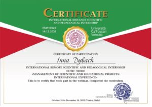 2023 р. – стажування «Management of scientific and educational projects: international experience”, Венеція, Італія (Сертифікат ESN°17626 від 16.12.2023, 180 години – 6 кредитів ЄКТС).