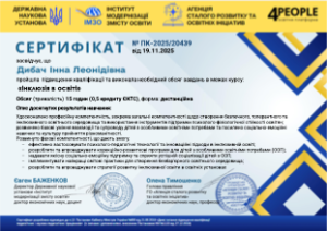 2025 р. – підвищення кваліфікації «Інклюзія в освіті» (Сертифікат №ПК-2025/204339 від 19.11.2025, 15 годин – 0,5 кредиту ЄКТС).