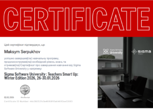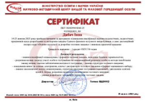 2025 р. – підвищення кваліфікації «Основи тестології та розробки тестових завдань» (Сертифікат № ПКТ 38282994/8260-25 від 29.10.2025, 30 годин – 1 кредит ЄКТС).