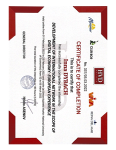 2022 р. – стажування в HVD Hotels (Bulgaria) Development of international network in the scope of Digital economy: European experience (Сертифікат № 337/05.03.2022, 180 годин – 6 кредитів ЄКТС).