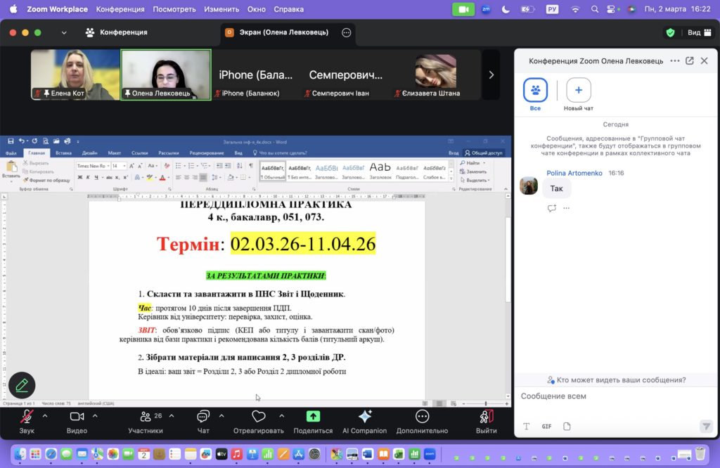 Відбулася організаційна зустріч здобувачів 4-го курсу з керівниками переддипломної практики, під час якої було обговорено ключові питання щодо проходження практики, вимоги до звітів та терміни її виконання.